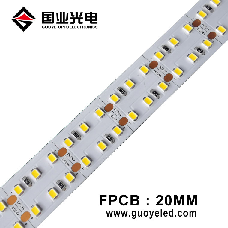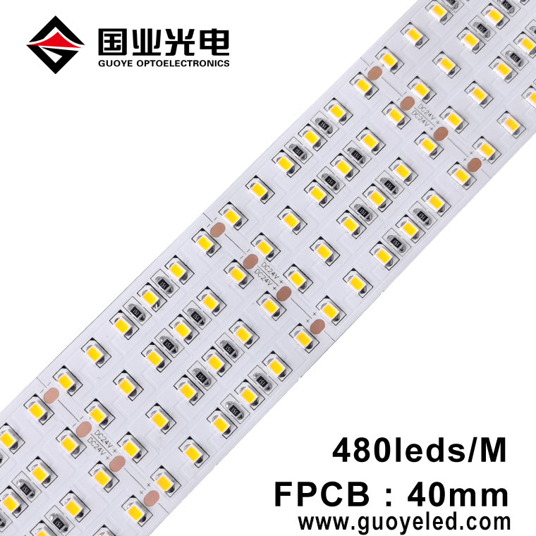 شرائط LED FPCB بعرض 40 مم تستخدم لوحة دوائر نحاسية كهربائية على الوجهين ، و 2835 SMD عالي التجويف 480 قطعة لكل متر ، يمكن أن تكون الطاقة 40 واط إلى 60 واط لكل متر ، السطوع ، الطاقة ، درجة حرارة اللون و CRI / RA يمكن تخصيصها.